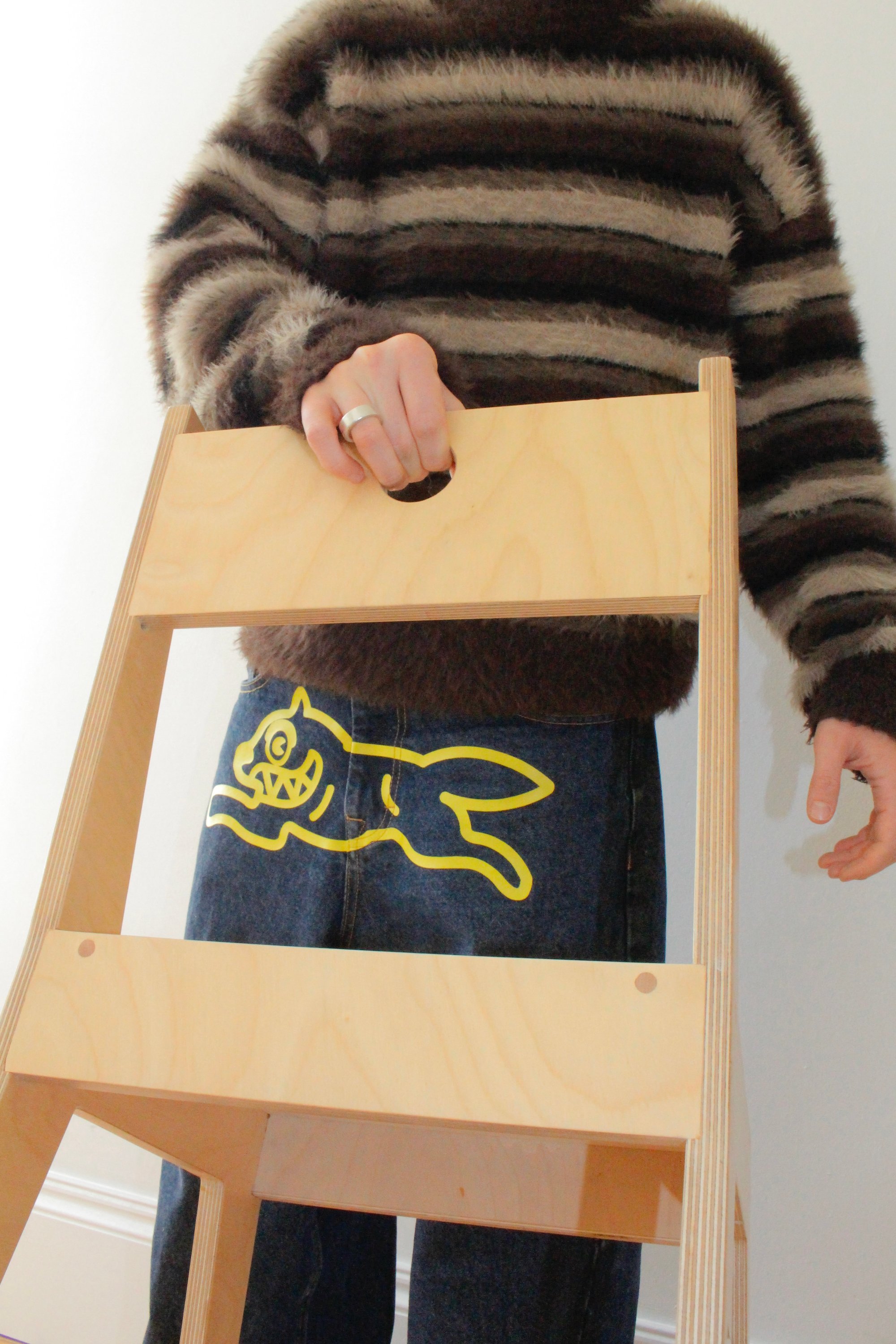 the chair is made from birch ply and measures 42 cm x 36 cm x 90 cm with floor to seat height of 47 cm. it is hand sanded and finished with three coats of polyurethane lacquer all over to make it easy to clean and gleam with durability.