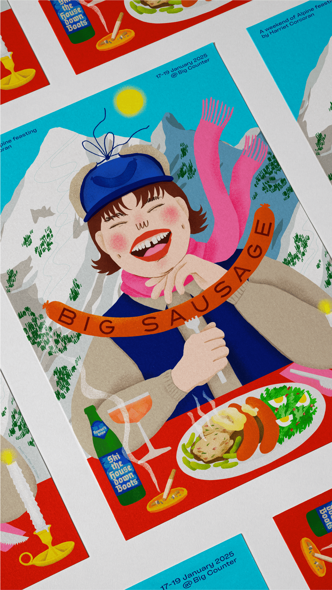 unmissable poster for big sausage by eden bø dower for alpine feast takeover by harriet corcoran at big counter, 2025.
