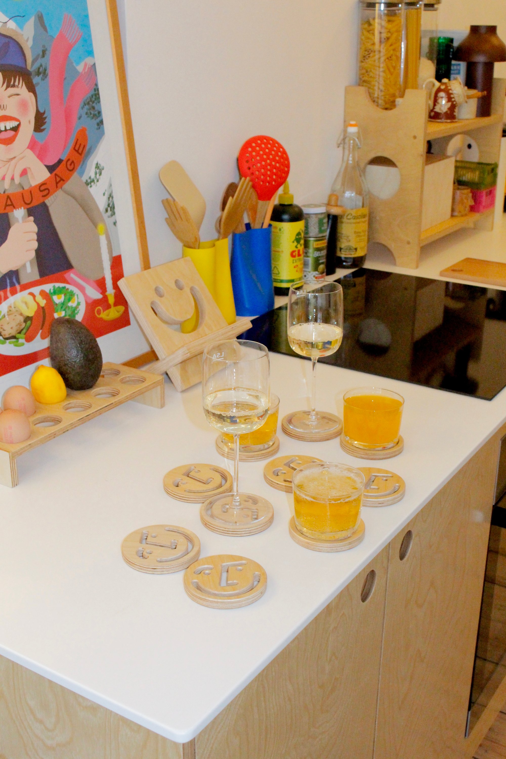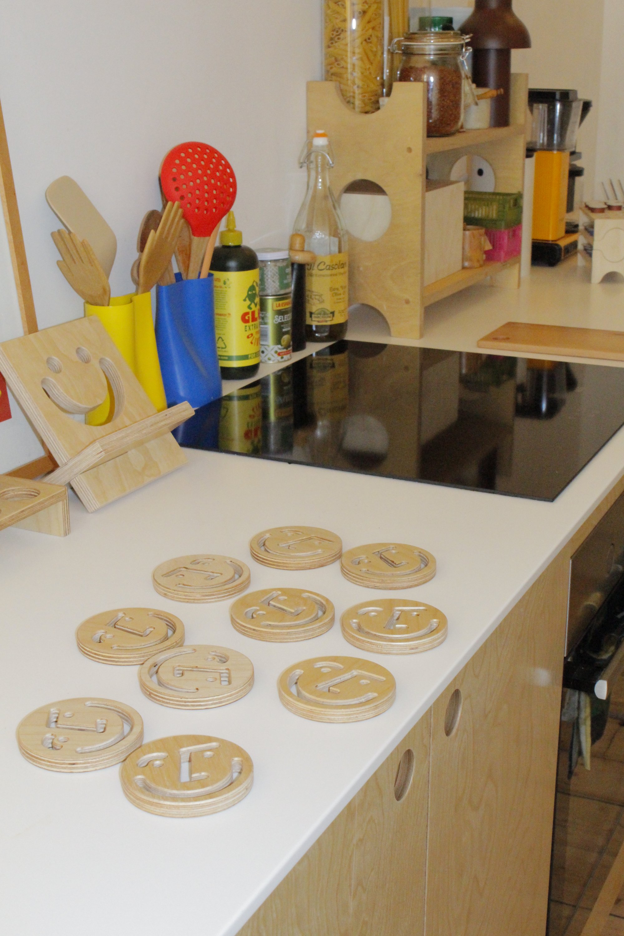 smiley coasters made from birch plywood, sanded and finished with three coats of polyurethane lacquer for a durable, easy to clean and shiny finish.
